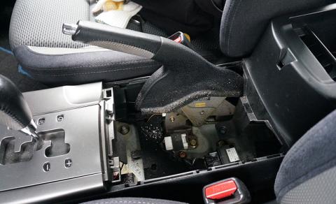 まずドリンクホルダーを外す。ツメで固定されているだけなので淵を軽く広げて引っ張るようだがぶっちゃけ上に向かって力任せに引き抜いてしまうようなカタチになってしまった。後(写真右側)から引っこ抜いて前を引っこ抜いて最後にシフトパネルとの接合部を外す感じ。