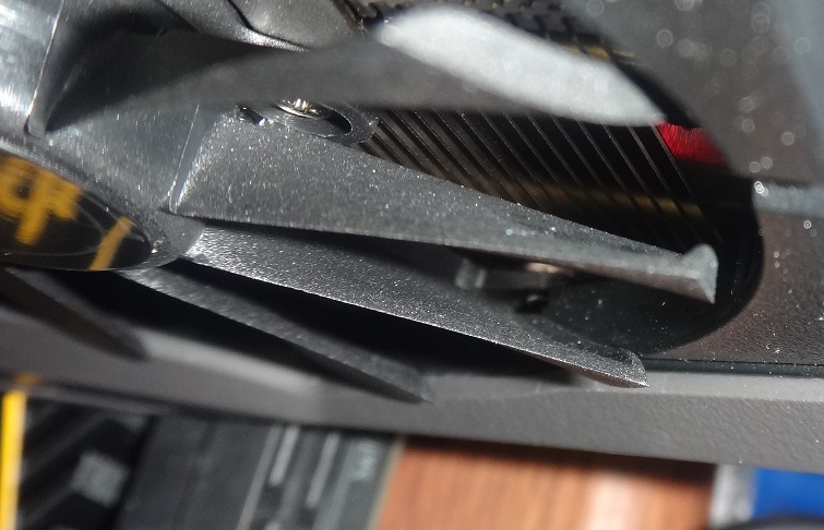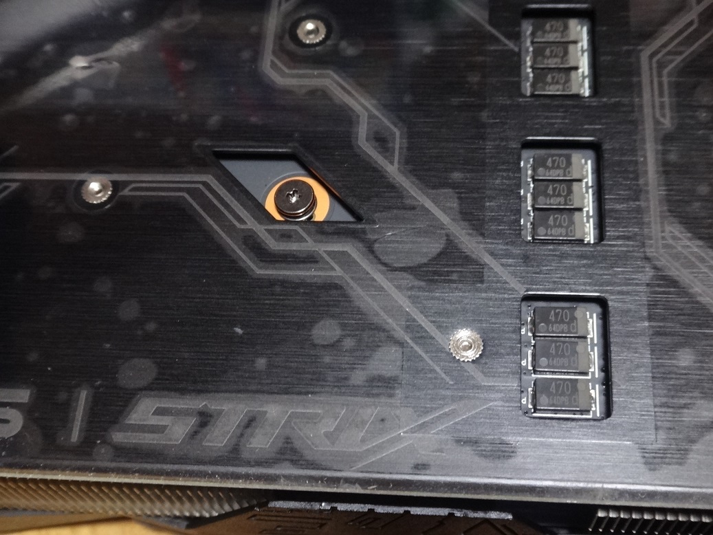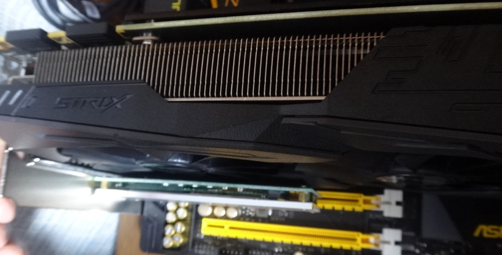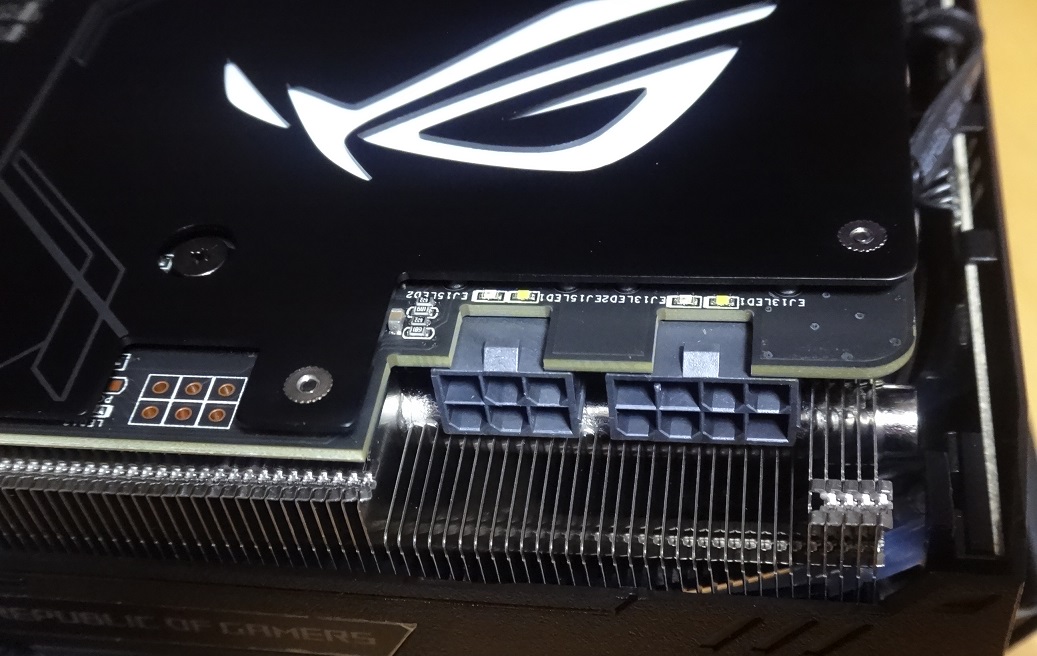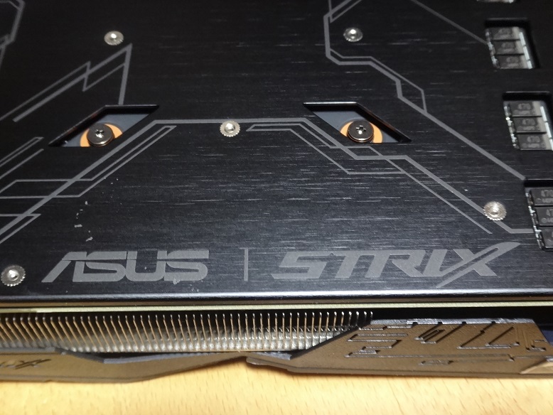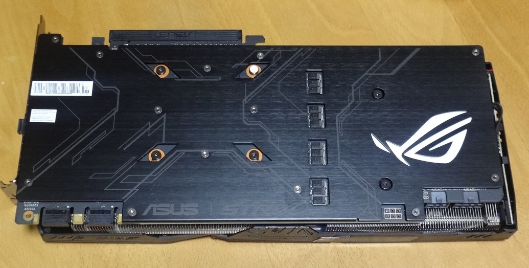 補 助電源は8PIN+6PINになっています。ASUS ROG STRIX GTX 1080はPCIブラケットよりも背が高いのですが補助電源部分の基板は引っ込んでおりPCケースとの干渉が避けられるよう設計されています。背の高いグ ラボはMSIやEVGAからも出ていますが意外とこの構造は採用されていません。気配りがありがたい。