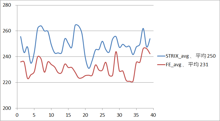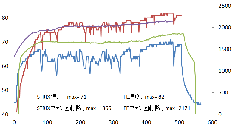 FoundersEdition では終盤でGPU温度が80度を超え、ファン回転数も2000RPMを超えていますが、ASUS ROG STRIX GTX 1080ではせいぜい70度前半に収まるように設計されており、ファン回転数も1500RPM程度で動作するので静音性にも優れています。