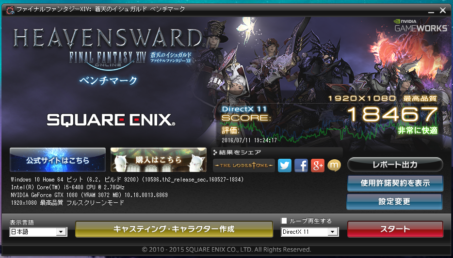 FF14 ベンチのフルHD最高設定の比較は次のようになっています。当ベンチマーク測定環境ではASUS ROG STRIX GTX 1080 OCでスコアは18467となりました。FF14ベンチはグラボの性能を測るというよりもFF14が快適に遊べるかを測るベンチマークの意味合いが強いの でスコア10000を超えた当たりからはCPUクロックへの依存性がかなり高くなってきます。