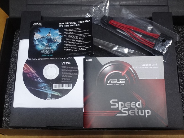 付属品は簡易インストールマニュアルとドライバCD、それと6PIN*2を8PIN*1に変換するケーブルが1個同梱されていました。オンライン登録コード用紙も付いています。