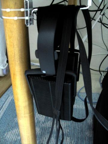 フックは10cm有りますのでヘッドホンは問題なく掛けられます 両面テープでは固定は無理だったのでロックタイ2本で固定しました(若干弱そう)