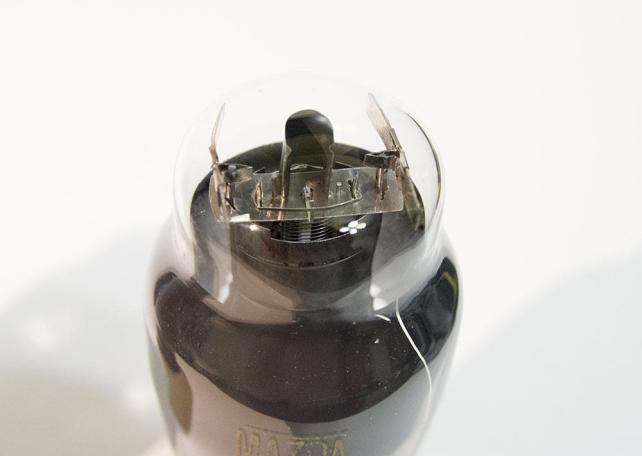 フィラメントを吊っている金具と、中央のヒーターを繋ぐパーツが特長的です。こういった構造の真空管って初めて見るような気がします。