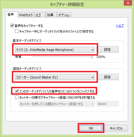 さらに2つのオーディオデバイスの音声をひとつのトラックにミックスするを選択