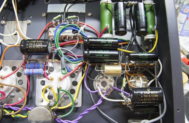 それでも、カソード抵抗と並列にはいっているパスコンの容量が十分でないアンプと、余裕たっぷりの容量のコンデンサがはいっているアンプとでは、音の仕上がりにずいぶんと違いが出ます。従来、ここには47μF~100μFくらいのコンデンサを入れるのが常識でしたが、私は経験上それでは足りないと思っています。すくなくとも220μF、できれば470μF~1000μFくらいを入れてやりたいところです。