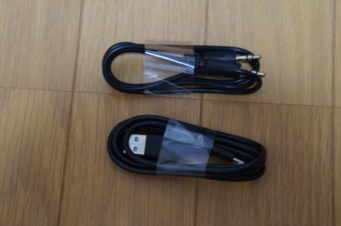充電用のMicroUSB-USBケーブルとオーディオケーブルも付属していて、外部入力にも対応しています。