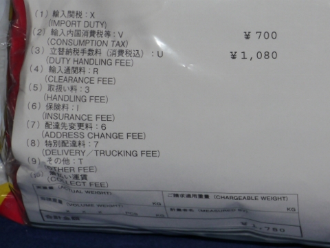 但し、荷受時に輸入内国消費税700円と手数料1,080円取られましたので