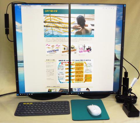 ディスプレイ設定は、写真撮影の都合上、縦画面を左右に並べているが、横画面を上下に並べても同じことで、片方のHDMIへスティックコンピュータを接続し、もう片方のHDMIへはマイクロソフトワイヤレスディスプレイアダプタを接続する。ワイヤレスディスプレイアダプタのUSBへの電源供給はディスプレイにあるUSB端子から供給できるかと思ったが、ディスプレイのUSB端子は独立しており外部から供給しなければならない。スティックコンピュータの電源にあるUSBから供給することにした。