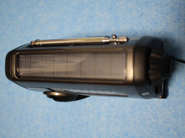 上部がソーラーパネルです。屋外で晴天時に充電すると、約1時間充電でFMが約40分、AMが約60分、ライトが約10分使えるそうです。