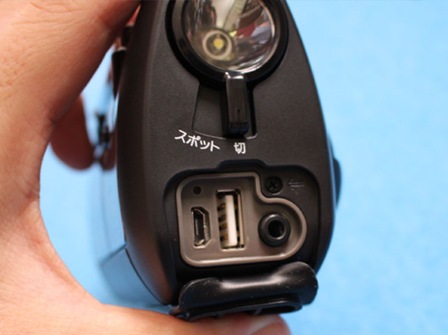 ライト下部のカバーを開けると、マイクロUSBとUSBポート、 ミニプラグ端子。