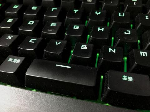 Razerのキーボードというと、とにかく黒地に緑という印象が強いのですが、電源を切っていると緑色が殆ど無く、地味な印象すら受けます。また、日本語配列ではあるのですが、カナの刻印はありません。本当は刻印があってくれないと、日本語配列の意味は半減してしまうのですが、最近は開発系の仕事は減っているので妥協しました。