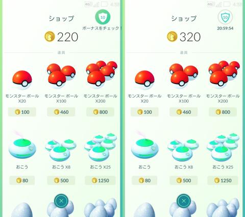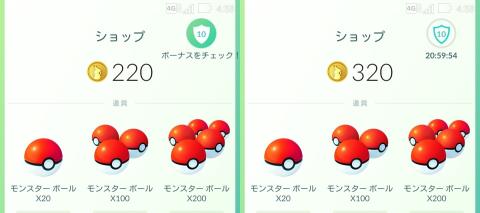 ポケモンをジムに配置するとショップで「ポケコイン」(リアルマネーで購入するゲーム通貨)と「ほしのすな」を入手できます。ショップにある「ボーナスをチェック」のボタンを押した瞬間に配置しているポケモンの数で入手できる「ポケコイン」と「ほしのすな」の数が決まり、ポケモン1匹にあたり「10ポケコイン」と「500ほしのすな」、最大でポケモン10匹の「100ポケコイン」と「5000ほしのすな」です。ボタンは押してから21時間で再度押せるようになります。21時間なのは、24時間だと毎日後ろにずれていくし、多少プレイする時間が違っても大丈夫なようにという配慮でしょうね。ちちなみに100ポケコインは約100円(一度にたくさん購入すると割安)です。またポケモンの配置自体には上限がないようなので、10匹をこえて、たくさん配置する事ができます。