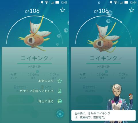 アップデートで個体値(ポケモンは同じ種類、同じレベルでも個体差があり、それを個体値と言います)をジムリーダーが評価してくれる機能が追加されました。一般的に使われる測定方法と比べると大雑把ですが、低い個体を判定するのには十分なので、それなりに使えそうです。またHPが他より低めの個体の場合は、攻撃と防御どちらが高いのかわかるし、100%の個体もわかります。