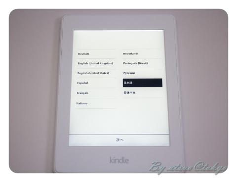 E Inkなので画面に電源位置が各国語で示されています。