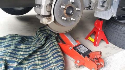 フロアージャッキがあれば一発で上げられますが、360mmしか上げられない油圧ジャッキなので片側づつ上げてウマを掛けました。