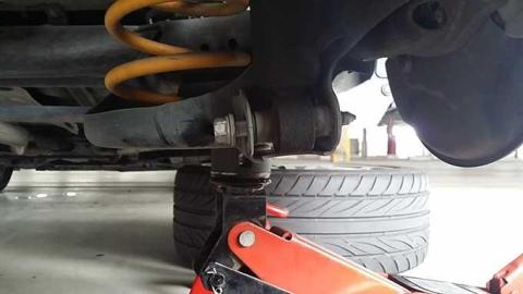 ショックを引っこ抜くのに、ボルトにテンションが掛かっているので、バネの下にジャッキを当てて取りやすくします。