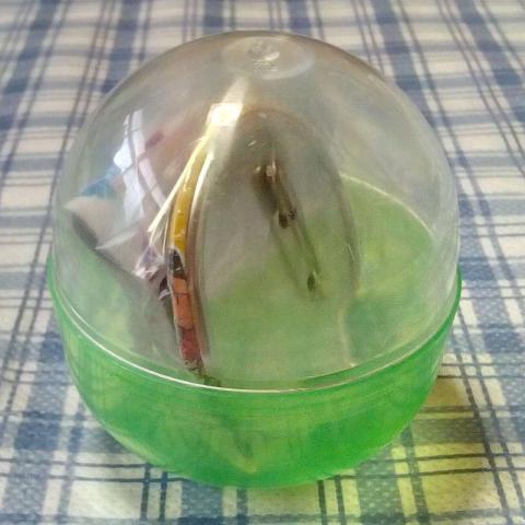 中の見えない黒い袋に入ってシールで封印されていすが、中はガチャガチャのカプセルが入っているようです。