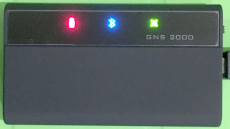 LEDの意味 赤:充電中は点滅、青:Bluetooth接続、緑:GPS衛星受信