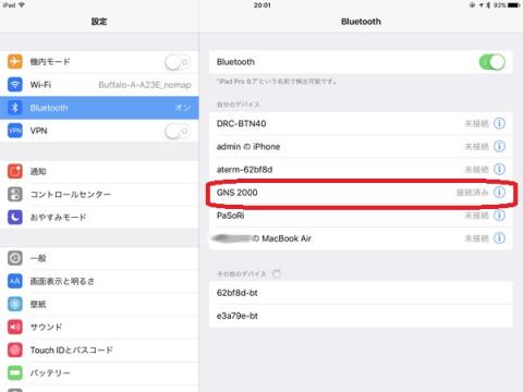 本GPSレシーバーの電源を入れて、iPadの設定/Bluetoothで「GNS 2000」をタップするだけで