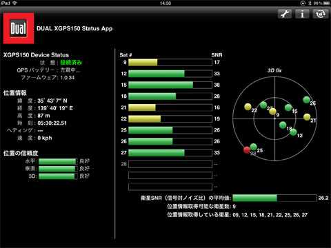 ただiOSソフトウェアの対応が貧弱というか、衛星をいくつ捉えているかなどGPSの状態を見る専用アプリがないので