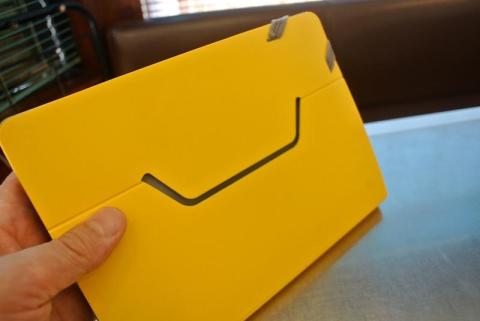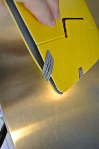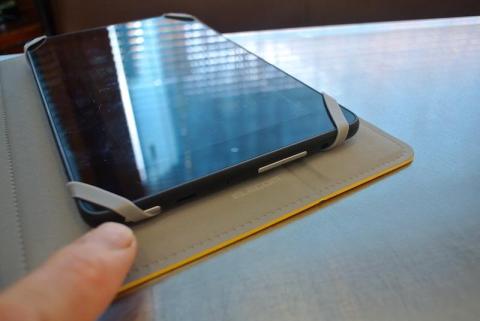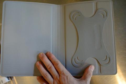 内側にシリコンゴム製の固定具(フレキシブルバンド)が装備されており、タブレットの四隅に引っ掛けるようにして7.0インチから8.4インチサイズに対応する設計でした。