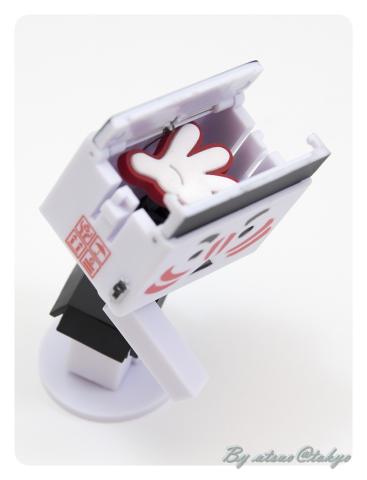 側面上部のポッチを両側から摘まむとフタが開き、中に手の形をしたマスコットが入っています。