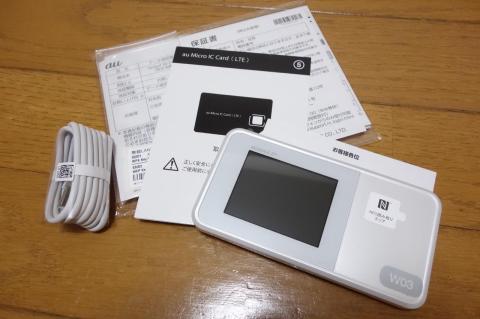 入っているのは W03 本体と USB ケーブル、au Micro IC Card、取説類だけ。