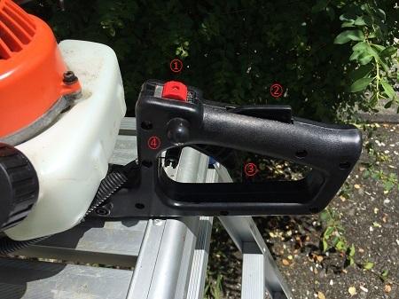 ②安全ロックレバー(握ると自然に安全ロック解除でスロットル有効)