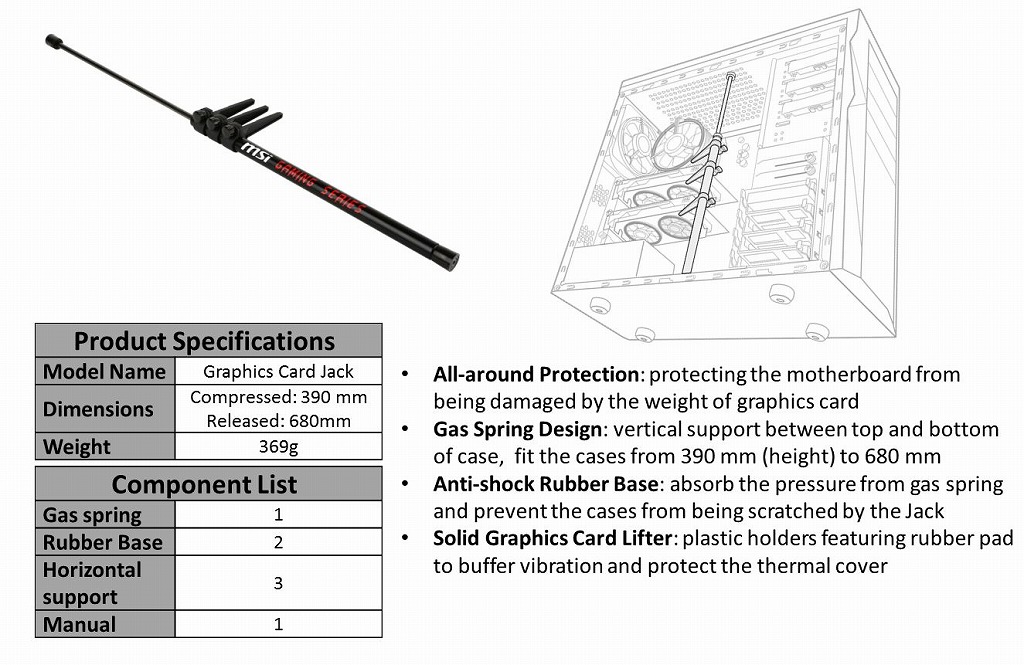 「MSI Graphics Card Bolster」の詳細な仕様は次のようになっています。