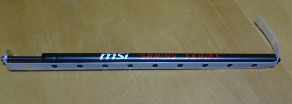 つっかえ棒については薄い金属製の棒の中にバネが入っているだけの百金とかで物干し竿用に売っている安っぽいものをイメージしていたのですが、実物では「MSI Graphics Card Bolster」の支柱はしっかりした頑丈な金属製で、スプリングはバネではなく(たぶん)ガススプリングになっていました。