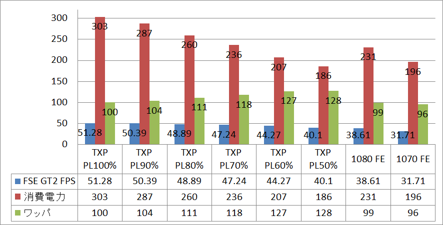 PL70% やPL50%のように1080や1070の定格と同じ消費電力までPLを下げてもパフォーマンスはTitanX Pascalのほうが高いというのが面白いです。NANOもそうですがGPUはワッパを上げるならデカいコアを緩く回すのが最適みたい。まあチップメー カー的に採算がとれない手法なので流行らないでしょうが。