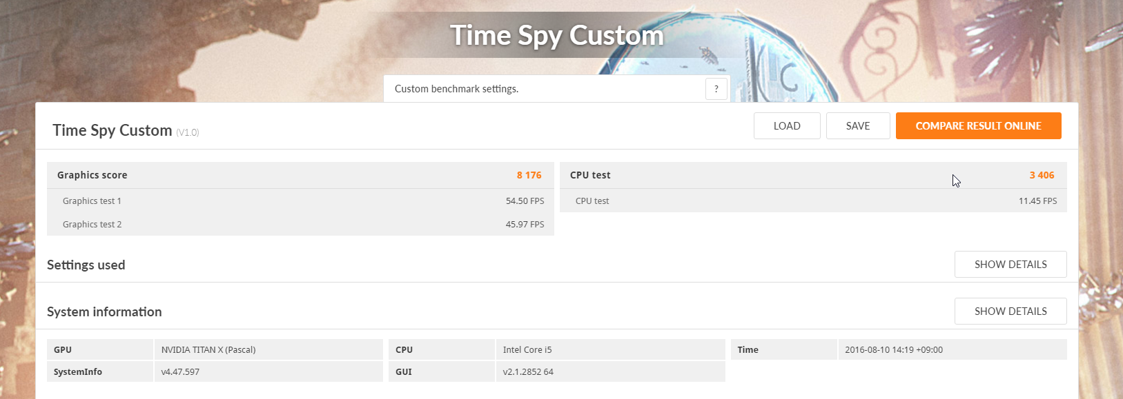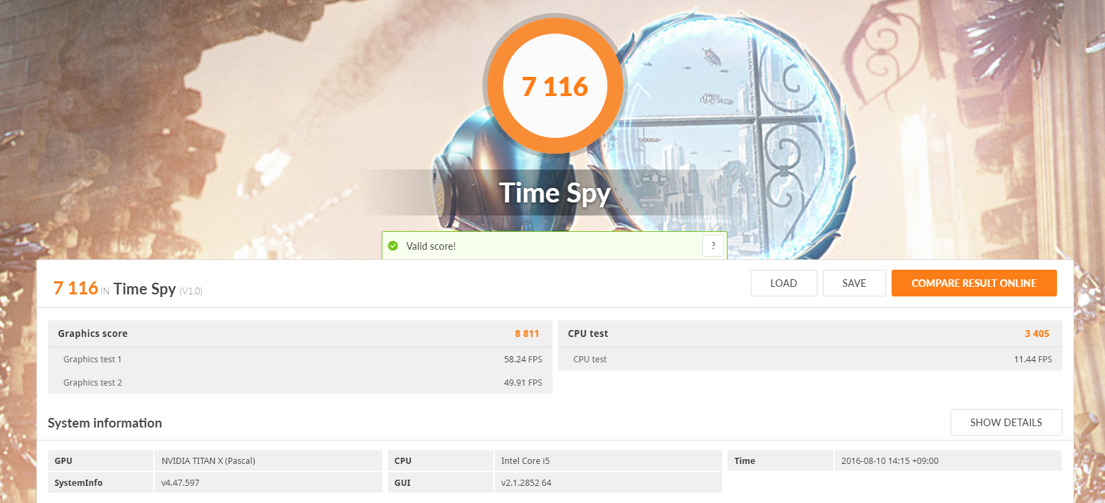 3DMarkの最新DirectX12ベンチマーク「TimeSpy」ではグラフィックスコアは8811となり、非同期演算の有効・無効による性能の伸び幅は7.7%程度でした。
