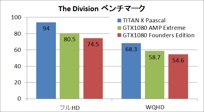 The Divisionのベンチマーク比較は次のようになっています。このゲームのベンチマークではこちらのグラフィック設定を用いて、フルHDとWQHDでベンチマークを行いました。