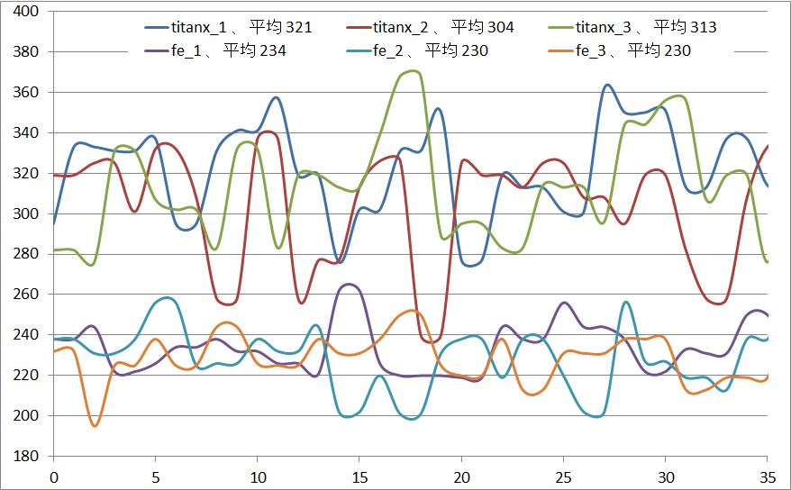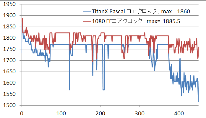 コアクロックについても確認してみるとサーマルリミットの影響で終盤のTitanXはコアクロックが安定せず、1600MHzまで下がってしまいました。