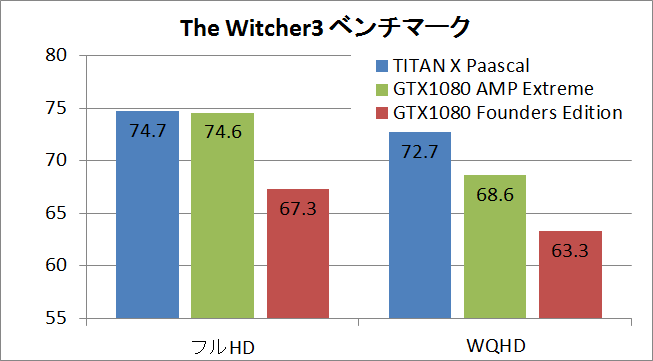 The Witcher3の ベンチマーク比較は次のようになっています。グラフィック設定は最高設定としてフルHDとWQHDでベンチマークを行いました。測定にはノヴィグラドの広 場から橋までを往復しています。