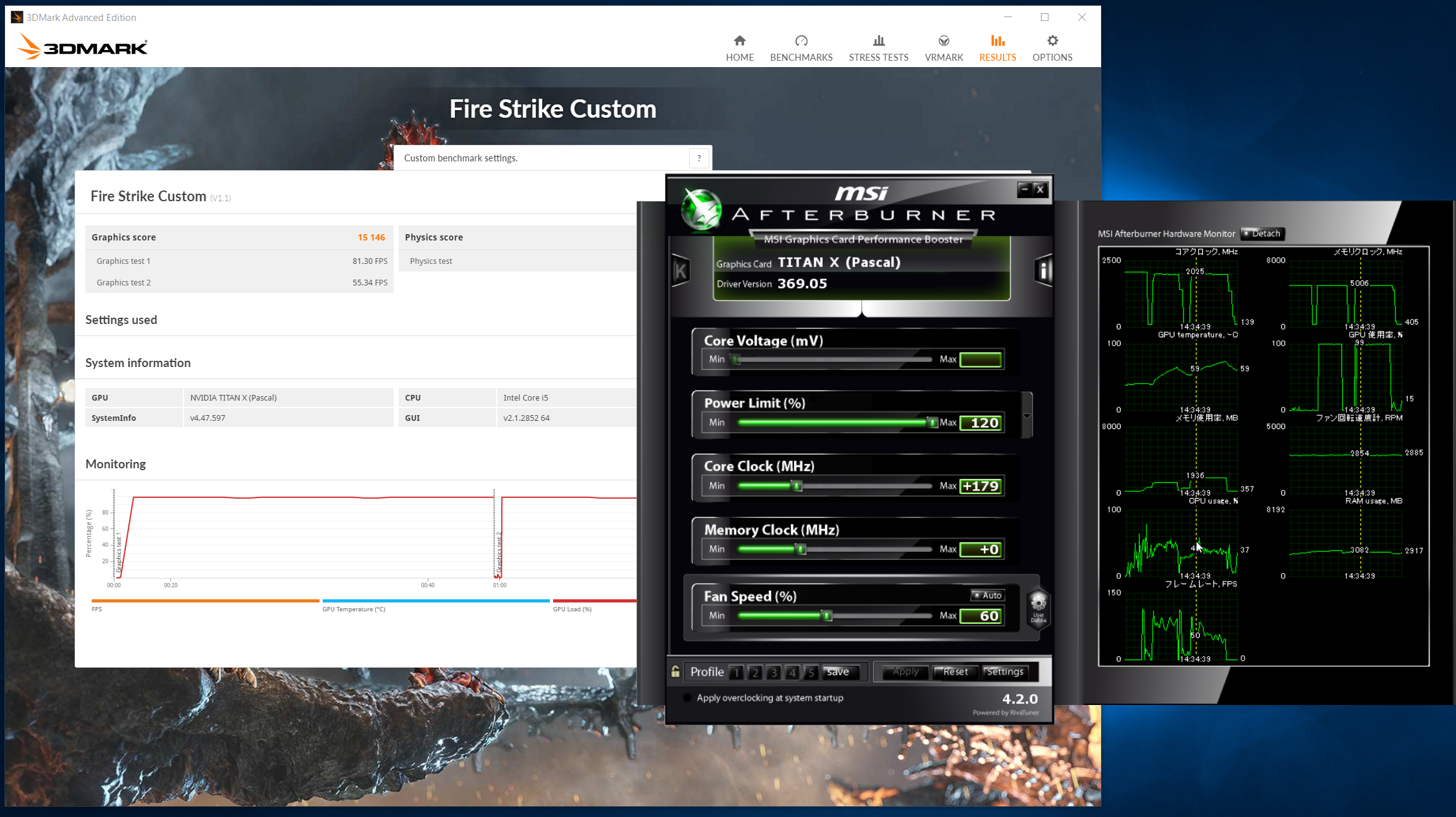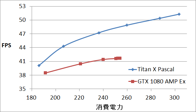 また以前GTX 1080 AMP Extremeでも同様にPL操作をしていたので、Titan X PascalとGTX 1080 AMP Extremeで比較してみました。GTX 1080のAIBモデルに比べてTitanXはPowerLimitの調整による性能の減少幅がやや大きいようです。