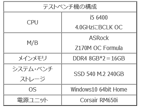 外観やハードのチェックはこのあたりにして早速、検証用の機材に組み込みました。テストベンチ機の構成は次のようになっています。CPUはASRockの Hyper BCLK Engineを使ったHyperOCでKなしCPUをOCするという若干変則的なものを使っています。