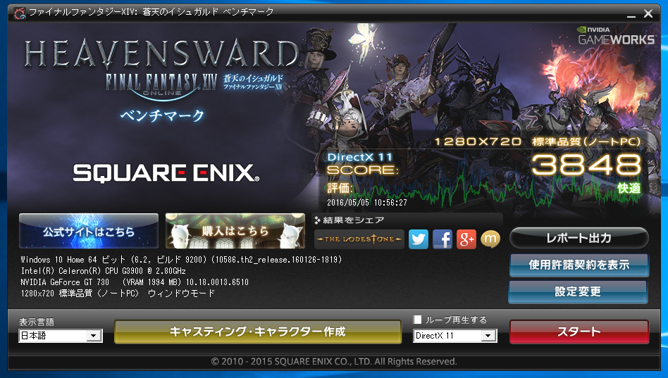 FF14ベンチのDX11、1280x720、ノートPC標準設定でスコアは3800ほどでした。6700Kや5775Cに内蔵されている統合グラフィックよりもスコアは低いですね。まあOCベンチや動作検証用なので問題なし。