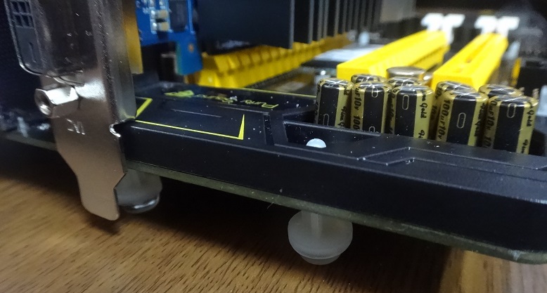 ベンチ板代わりのマザボ足のおかげでグラボを挿しても机と干渉することはありません。