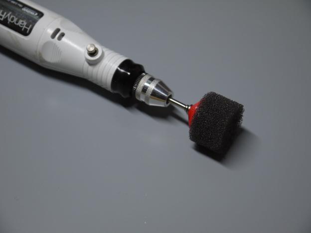 プラモの磨きや研ぎ出しは通常であればメガネ拭きのようなクロスでコンパウンドを使って行いますが、これが結構面倒で私的には疲れる&キレイに出来ないと苦手だったので、リューターの先端にビットの代わりに付けるコレを買ってみました。。