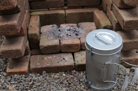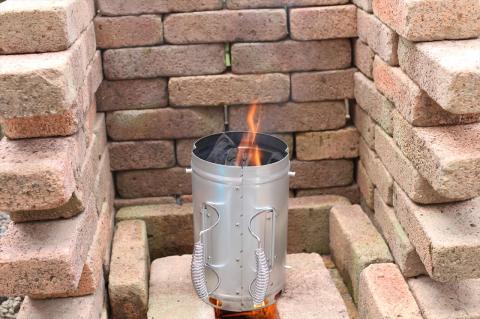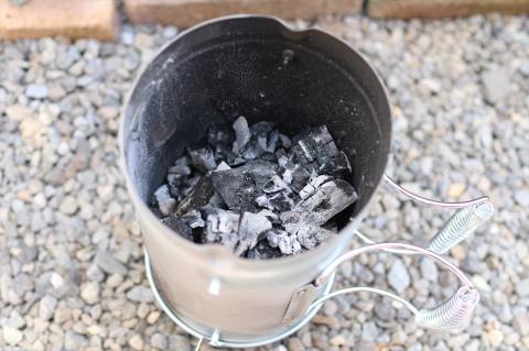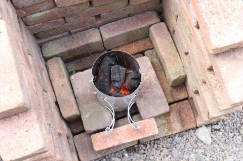 こんな風に適当に炭を放り込んで、下に焚き付けなどで火をつけると、煙突効果でどんどん燃え上がって炭に火が付きます。