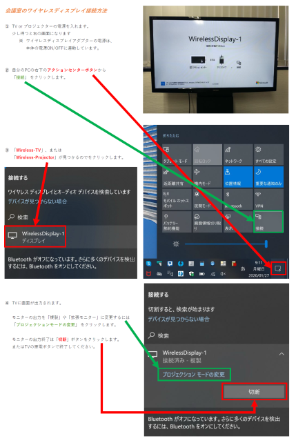 上記で作成したマニュアルのように「アクションセンターボタン」から「接続」をクリックするだけです。