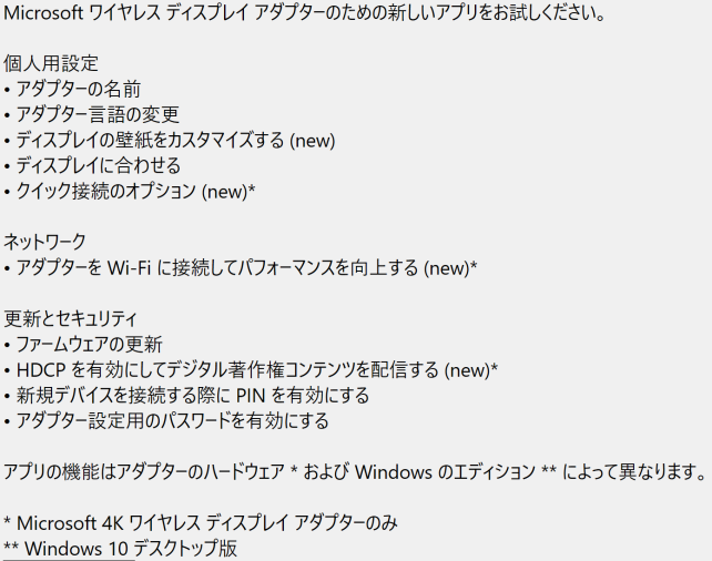 ちなみにWindowsストアの接続アプリの更新情報によると、新しい4K版は以下が新機能