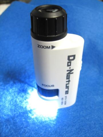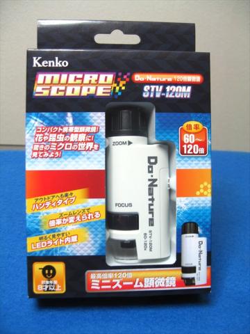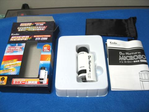 ケンコーの顕微鏡(マイクロスコープ)で、倍率は60~120倍です 下側には対物レンズ、FOCUSリング、上部には接眼レンズ、ZOOMリングが有ります ピントの合う試料と対物レンズの距離は6ミリ位です(プラ製ガード、ツラ位置付近でピントが合います)プレパラート類は設置できないし付属もしません 本体保護袋と取り説が付いています 平らな処を見るには簡単ですが凸凹面を見るには