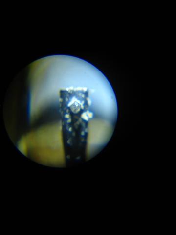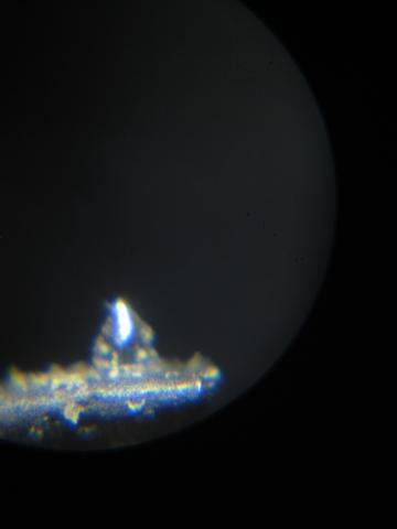針の磨耗の例 磨耗すると頂点が光に反射して上部から観ると白い点に見えます