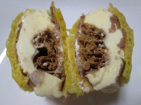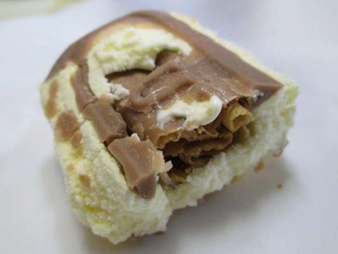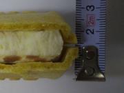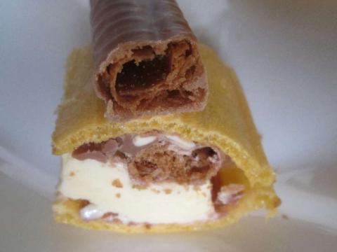 横方向にミニルマンドの側面が見えるように切断したところ、ミニルマンドはちゃんとルマンドだとわかりました。ココアクリームでコーティングされています。