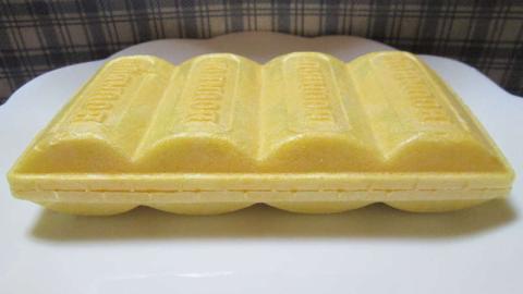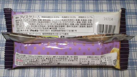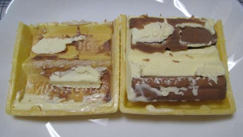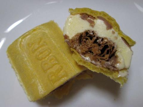 早速開封。俵型のモナカアイスの 4連構造です。パッケージからもわかるように、この俵の中に 1本まるまるミニサイズのルマンドが埋まってるのです。