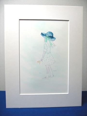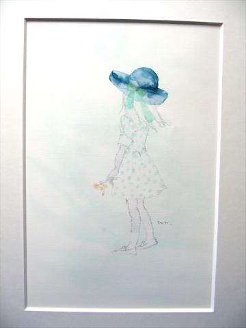 印刷...被っている帽子はオリジナルは緑色ですが、リビングに置いてあったので太陽光で青に退色しているようです 印刷で変色もおかしいですが、もともと青だったのかな(帽子のリボンは緑ですので)...額縁付きですが額縁破損・DIY補修中のため絵だけだしました。