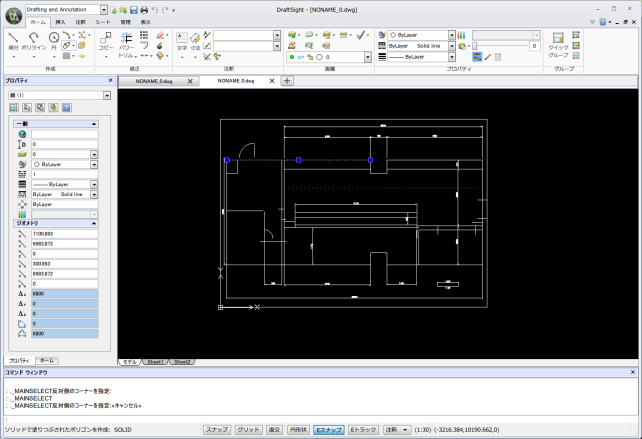 ダウンロードするところから、DraftSight未経験で、オンラインのマニュアルと非公式な使い方サイトを見ながら半日かけて平面図が描けました(冒頭の画像)。