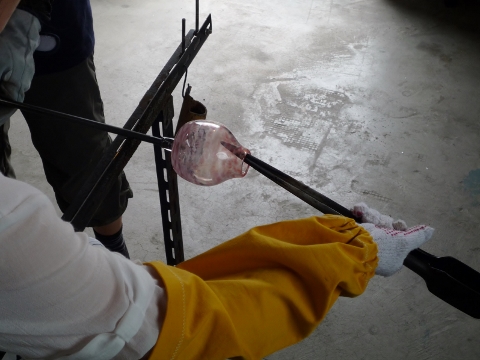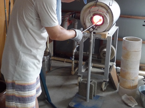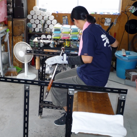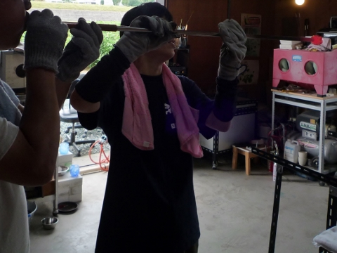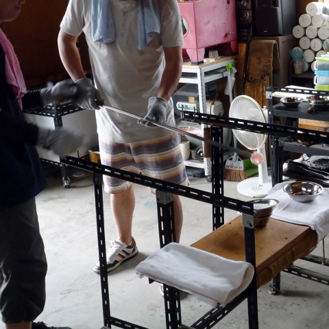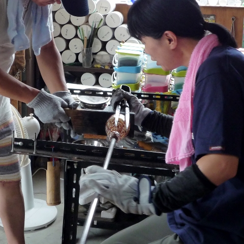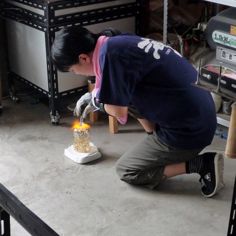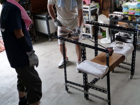 底の部分を木製の包丁のようなもので押さえ、作ります。